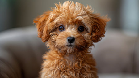 An adorable brown Poodle dog sitting on sofa with the toy when relaxing at home.
