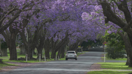 car driving past large flowering jacaranda trees at grafton