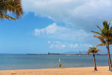 Townsville, Queensland, Australia - June 2020: Lifeguard safety flag and sign on the sandy beach at the waters edge with an industrial wharf backdrop