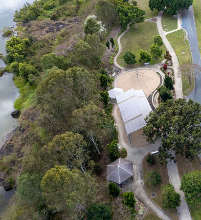 Looking down onto Edward Lloyd Park Marian Queensland Australia from high drone aerial