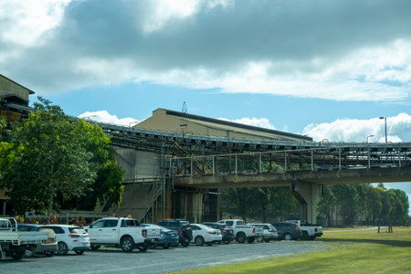 Mackay, Queensland, Australia - October 2021: Racecourse sugar mill during crushing season with workers cars parked out front