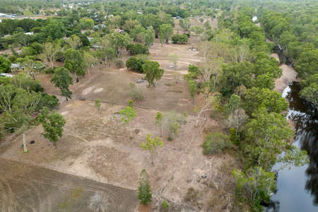 Drone flight over rural acreage properties backing onto a shallow tree lined creek