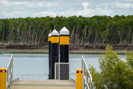 A forest of coastal trees on the banks of a tidal river with a boat ramp in the foreground