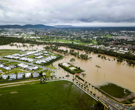 Aerial view of flooded town and river with brown floodwater, Townsville, Queensland