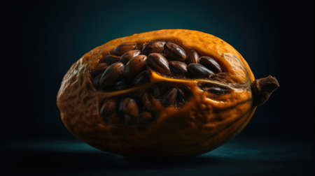 Open cocoa fruit with cocoa beans inside, on gray background, used to make chocolate, ai