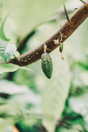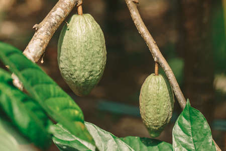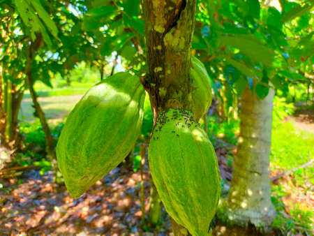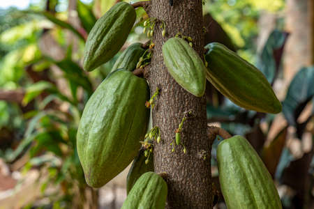 Cacao fruits on cocoa tree. The seeds from the fruits are called cocoa beans, which are used in chocolate, confectionery and cocoa powder. Flora of Bali island, Indonesia