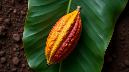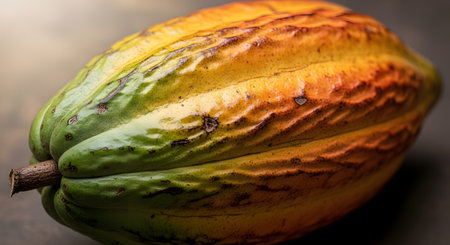 A detailed close-up shot of a single, ripe cacao pod, showcasing its textured skin with a vibrant gradient of green, yellow, and orange colors. The pod is the source of cocoa beans used to make chocolate. This image represents agriculture, raw ingredients, superfoods, and the origins of chocolate.