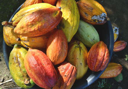 A big bunch of colorful cocoa pods. Criollo, Forastero, Trinitario, different types of cocoa beans just harvested from cocoa tree. Hundreds of exotic ripened fruits ready for making dark chocolate