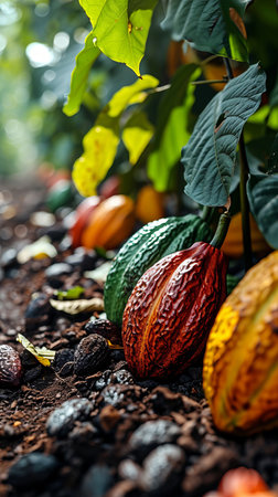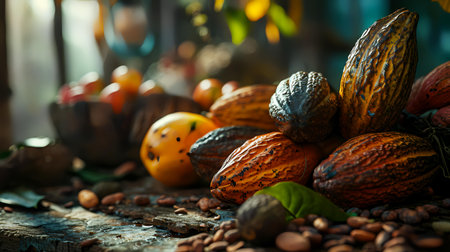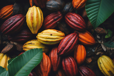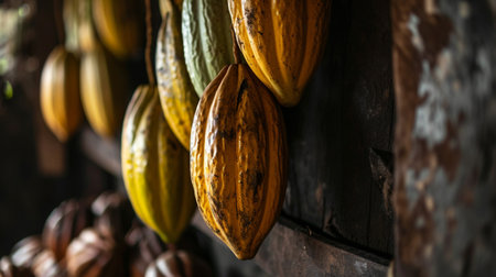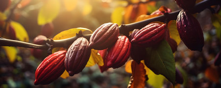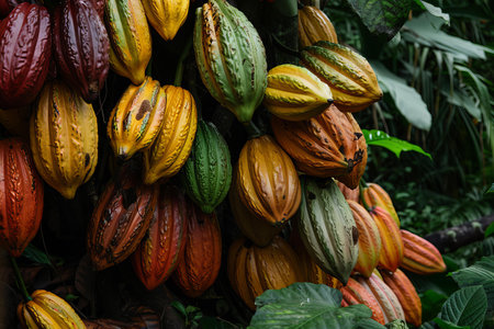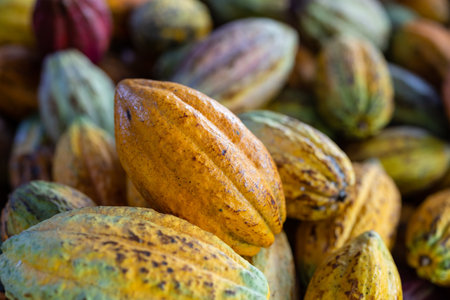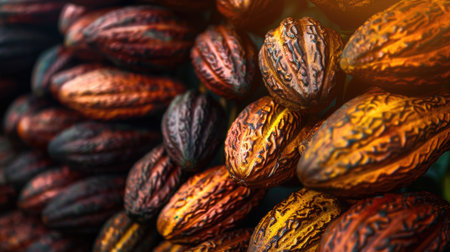 Mature cocoa pods ready for harvest: a close-up view. Concept Cacao Pods, Harvest, Close-up View, Mature, Agriculture