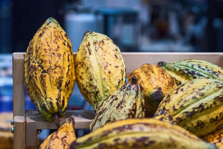 Fresh cocoa pod harvest in chocolate factory