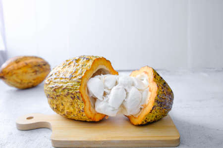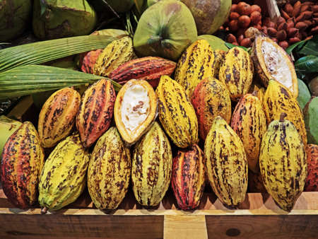 Fresh cocoa with cocoa pods and cocoa fruit cut in half