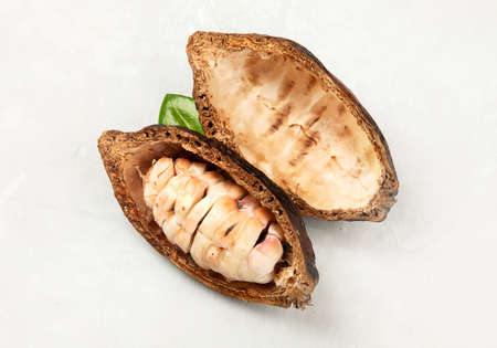 Chocolate plant pods open and show white seeds isolated on white studio background clsoe up view