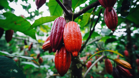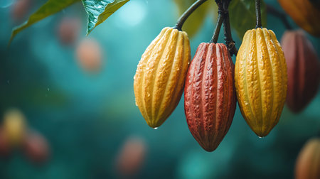 Vibrant cacao pods in various stages of ripeness hanging from a cacao tree, set in a lush green background