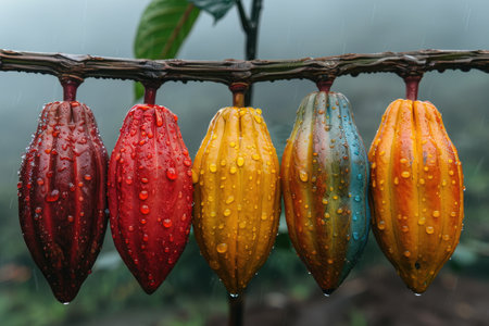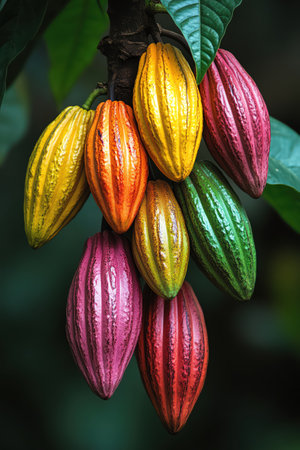 Colorful cacao pods growing on a tree branch