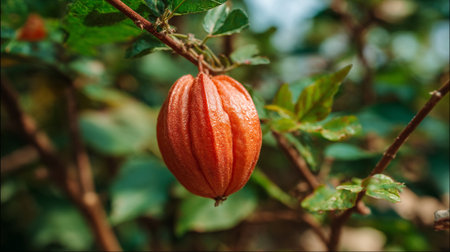 A beautiful orange seed pod hanging from a small tree branch.
