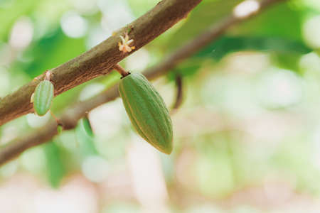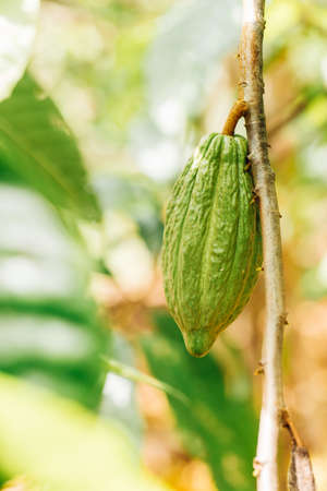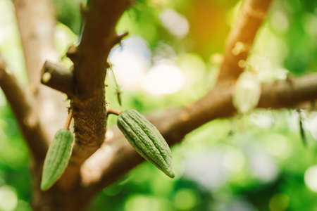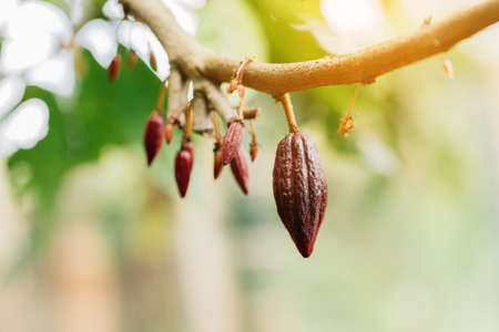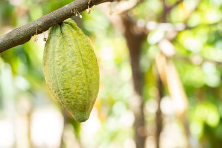 Cocoa plant pod hang on tree on blurred tree background