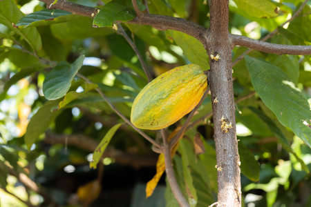 Yellow-colored cocoa fruit is lined up on the tree and the background of the cocoa plantation.