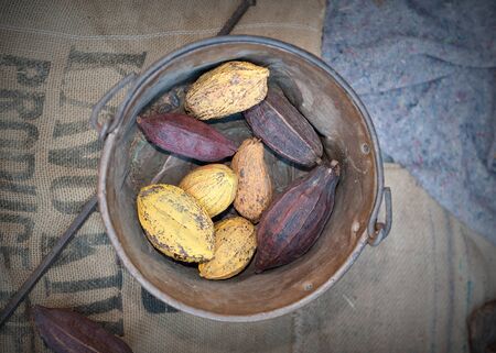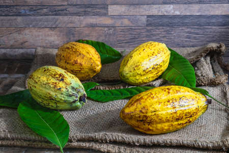 .Fresh cocoa fruit on brown sack
