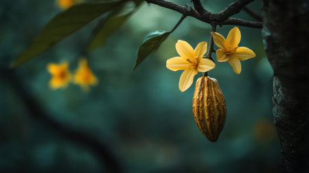A stunning close-up of yellow flowers and a cacao pod hanging from a tree branch, set against a softly blurred green background, showcasing the beauty of nature.