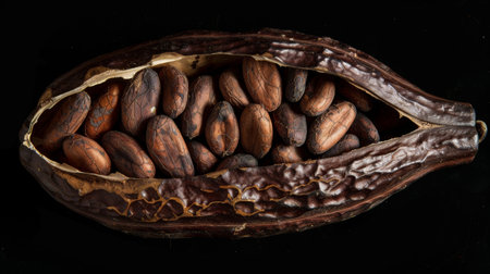 various cocoa pods within hub isolated on dark background