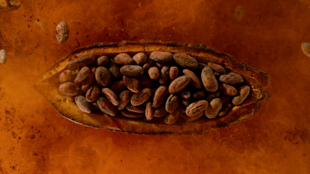 Cocoa fruit with cocoa beans exploding. Top view.