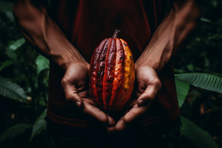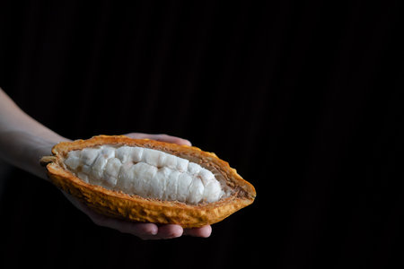 farmer hand holding opened raw fresh ripe cacao pod
