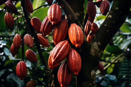 Cacao Tree (Theobroma cacao). Organic cocoa fruit pods in nature.