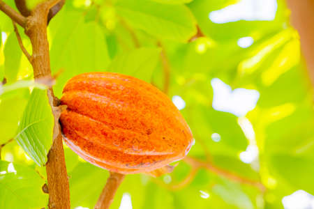 Cacao on a tree in the orchard. Fresh Cacao fruits