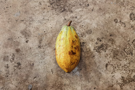 Picture of the yellow shell cocoa fruit on hand, Fruits that are processed into desserts.