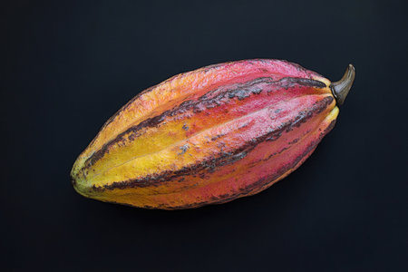 Ripe cocoa fruit displaying a mix of yellow, orange and red hues, isolated on a black backdrop