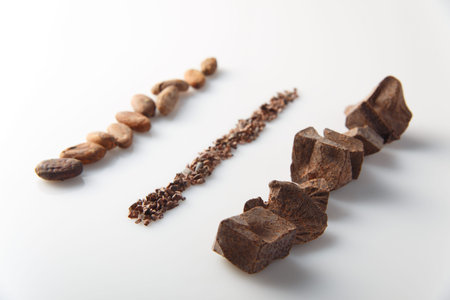 Cocoa beans with chocolate on a white background. Shalllow dof.