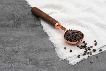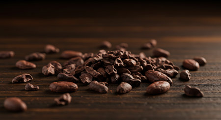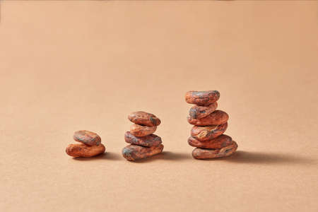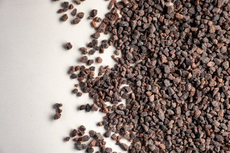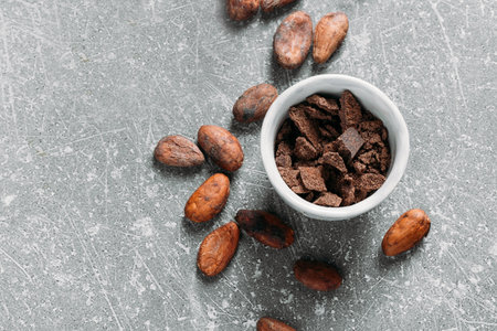 Cacao beans on grey concrete background. Raw fermented. organic cocoa seeds for hot chocolate drink. Flat lay, copy space for food and drink recipe. Healthy nibs