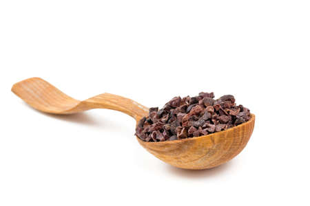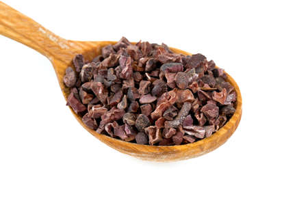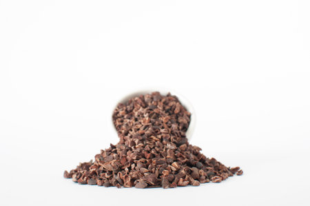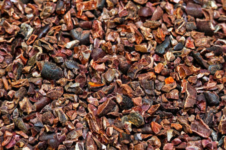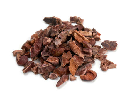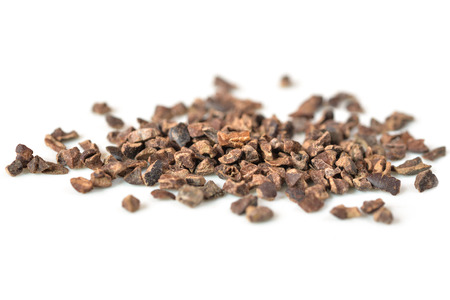 Crushed cacao beans in a pile on a white background. cacao nibs. Selective focus.