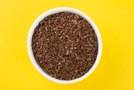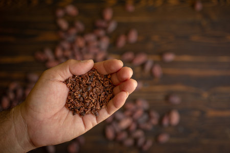 Chocolate Cacao Nibs or Cocoa Nibs in Bowl Ready to Use on Dark Wooden Surface. Ready to Eat.