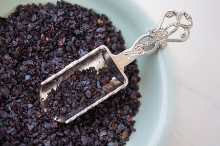 Dried cocoa beans. Cacao beans in jar on kitchen table.