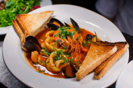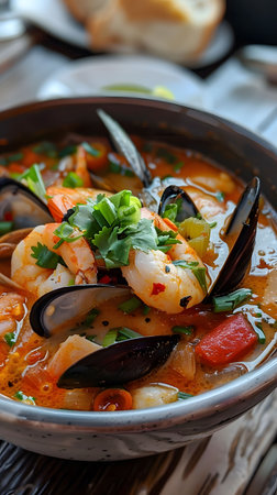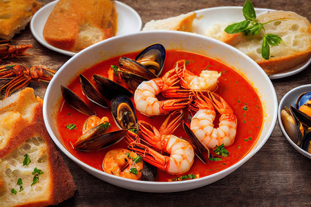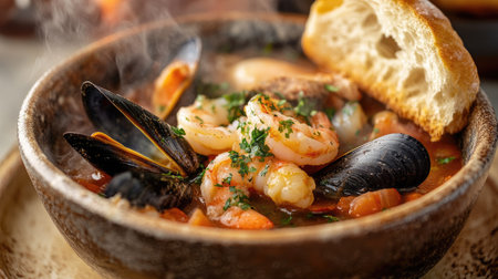 Steaming hot bouillabaisse soup with fish, mussels, and shrimp, served with bread