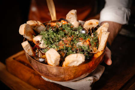 Seafood Stew in Saucepan. Authentic italian restaurant cuisine, healthy delicatessen food. Oysters, shrimps, calamari in white cream sauce with bruschetta. Bowl on dark black wood background, filtered
