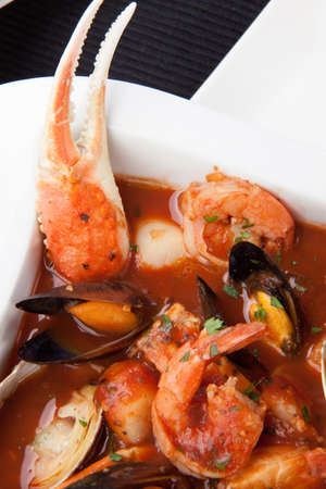 Bowl of Cioppino seafood stew with shrimps, scallops, crabs, clams, mussels, and fish