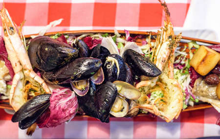 Prown,shrimp and mussels with rocket salad dish served in restaurant. Upside view.