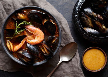 Spicy french soup bouillabaisse with seafood, prawns, mussels. Sauce Rouille. Traditional in France and Spain.Dark rustic style. Flat lay.