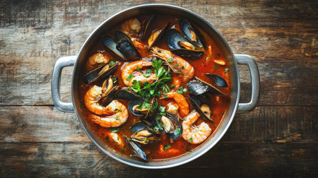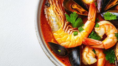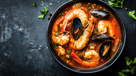 Top view of a Cioppino seafood stew in a bowl, featuring shrimp and mussels. Rich broth and fresh seafood. Perfect for gourmet food photography with space for text.