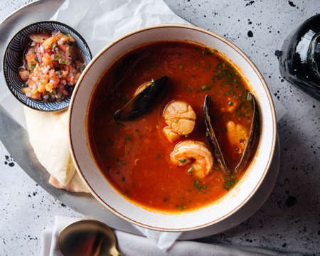 French bouillabaisse fish soup with shrimp, mussels and scallop. In a white plate on a textile background