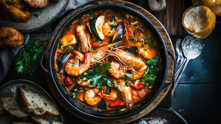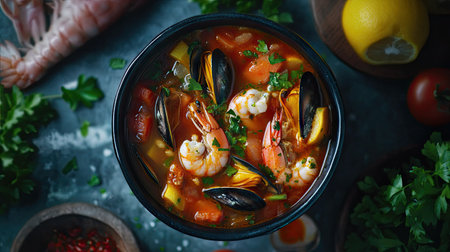 A mouthwatering top-down view of bouillabaisse soup, highlighting a mix of seafood in a fragrant broth, presented in a deep bowl surrounded by vibrant garnishes for a colorful dining experience.