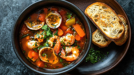 A stunning top-down view of a bowl of bouillabaisse, featuring vibrant seafood and vegetables in a flavorful broth, beautifully presented with a sprinkle of herbs and a side of garlic toast.