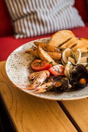 Seafood soup with shrimps, mussels and clams