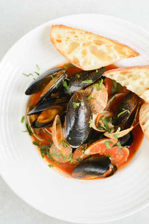 Tomato seafood soup with mussels and addition of shrimp and aromatic herbs