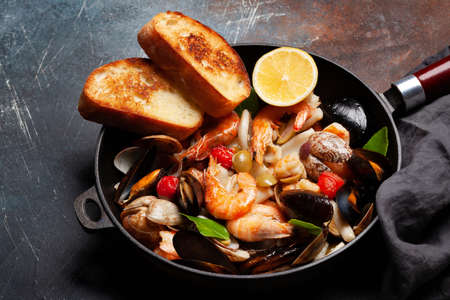 fresh seafood stew prepared on an iron skillet ove white rustic wood table