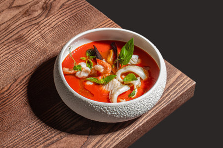tomato soup with seafood on table