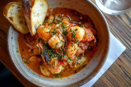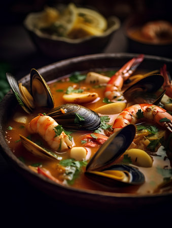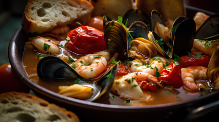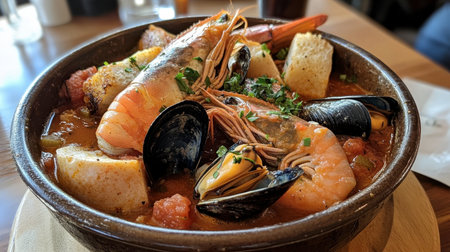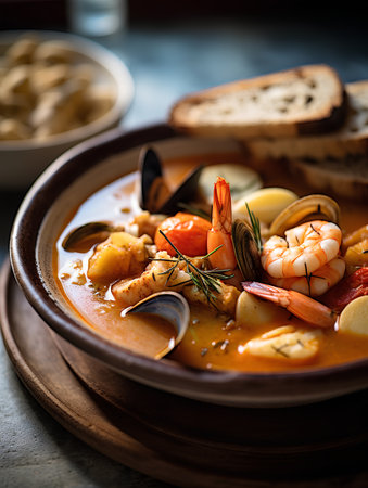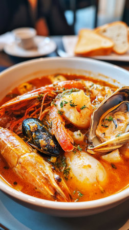 Delight in bouillabaisse, a rich seafood stew bursting with flavors, garnished with fresh herbs and served with crusty bread on a sunny afternoon