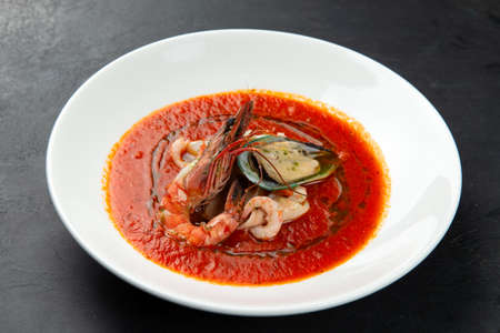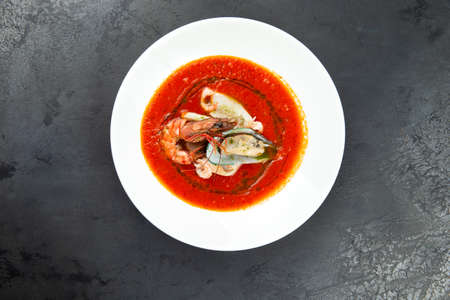 Red soup with sea products in a plate on a dark background. selective focus